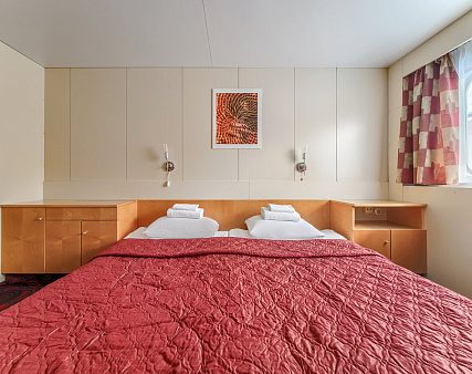 В каюте: четыре спальных места (два внизу, два вторым ярусом), шкаф для одежды, холодильник, телевизор, фен, радио, душ, санузел, кондиционер, два иллюминатора, электророзетка на 220V.