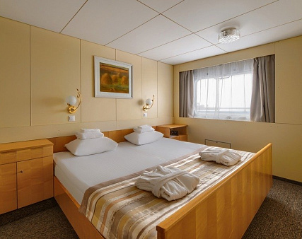 В каюте: два спальных места, шкаф для одежды, холодильник, телевизор, фен, радио, душ, санузел, кондиционер, обзорное окно, электророзетка на 220V.