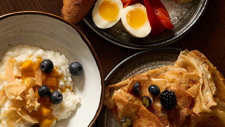 - Завтрак, обед – заказная система, фиксированная рассадка с элементами шведского стола (фрукты, десерты, соусы) и включенными напитками (вода, чай, кофе, домашний морс, сок) без ограничения;