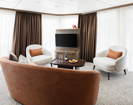 В каюте: терраса, двуспальная кровать, прикроватные тумбы, диван и два кресла, журнальный стол, туалетный столик, стул, шкаф, телевизор, холодильник, капсульная кофемашина (1 капсула в день на человека (по количеству гостей в каюте), чайник, радио, телефон, санузел с душем, кондиционер, фен, сейф, электророзетка на 220V.