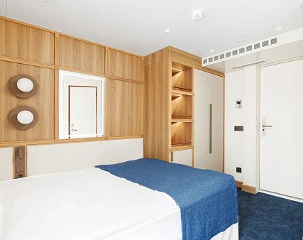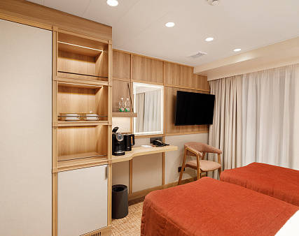 В каюте: две односпальные кровати (можно сдвинуть), прикроватные тумбы, туалетный столик, стул, шкаф, телевизор, холодильник, капсульная кофемашина (1 капсула в день на человека (по количеству гостей в каюте), чайник, радио, телефон, обзорное окно, душ, санузел, кондиционер, фен, сейф, халаты, электророзетка на 220V.