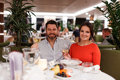 - Ужин — заказная система питания (выбор блюд со 2-го дня круиза), фиксированная рассадка. Включённые напитки (без ограничения): вода, чай, кофе, домашний морс. На выбор: вино красное / белое / игристое (1 бокал, 125 мл) / водка (1 рюмка 50 мл) / пиво (1 бокал, 300 мл).