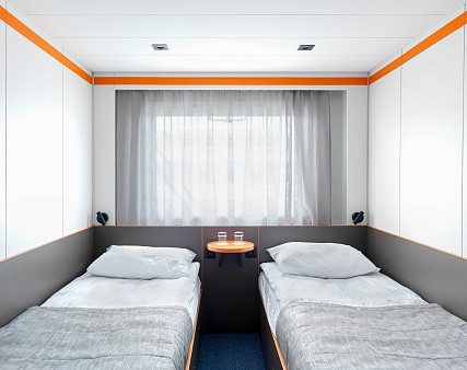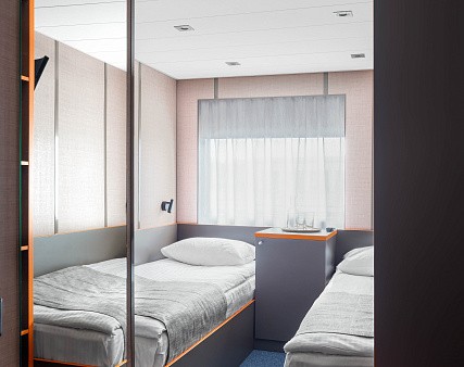 В каютах 401, 402, 404, 410, 411, 431-434 (шлюпочная палуба), 319-322, 339, 340, 345, 346, 365, 366, 369, 370 (средняя палуба) — две односпальные кровати размером 80х180 см, площадь каюты 10 м2