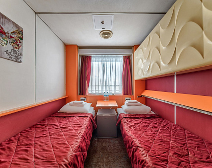 В каюте: два спальных места (одно над другим), шкаф для одежды, радио, центральный кондиционер, холодильник, телевизор, душ, санузел, фен, сейф, обзорное окно (в каютах, расположенных на главной палубе, после переоборудования в 2020 году окно не открывается согласно технике безопасности и требованиям морского регистра), электророзетка на 220V.