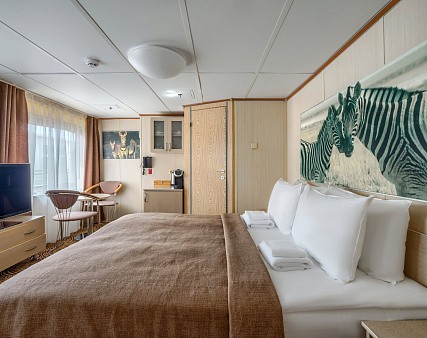 В каюте: две кровати, кровати не сдвигаются, шкаф для одежды, стол-бюро, кресло, телевизор, холодильник, радио, сейф, фен, два обзорных окна, электророзетка на 220V.
