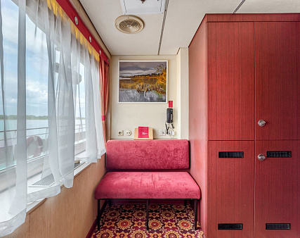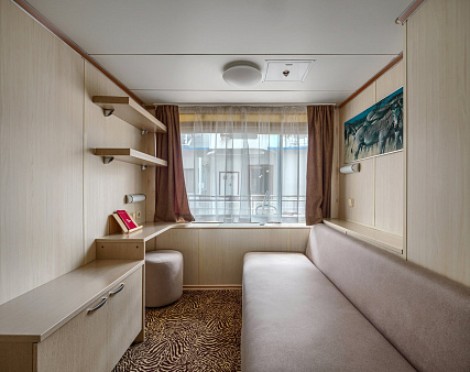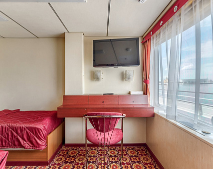 В каюте: два спальных места, не сдвигаются, шкаф для одежды, радио, центральный кондиционер, холодильник, телевизор, душ, санузел, фен, сейф, обзорное окно (в каютах, расположенных на главной палубе, после переоборудования на в 2020 году не открывается согласно технике безопасности и требованиям морского регистра), электророзетка на 220V.