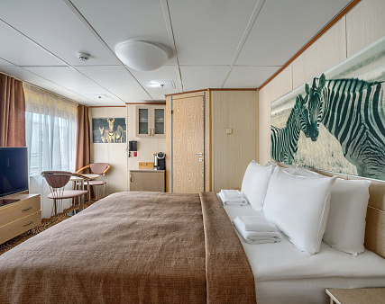 В каюте: две кровати, кровати не сдвигаются, шкаф для одежды, стол-бюро, кресло, телевизор, холодильник, радио, сейф, фен, два обзорных окна, электророзетка на 220V.