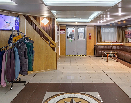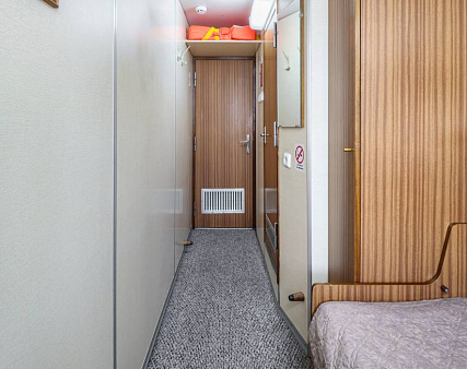 В каюте: одно спальное место, шкаф для одежды, зеркало, радио, душ, санузел, кондиционер, обзорное окно, электророзетка на 220V.