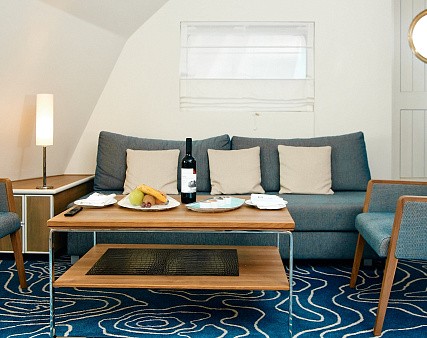 В каюте: кровать и диван (расположены буквой Г), кондиционер, гардероб, телевизор, телефон, фен, сейф, халаты, увлажнитель воздуха. Ванная комната с душем и туалетом.
