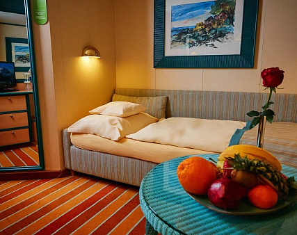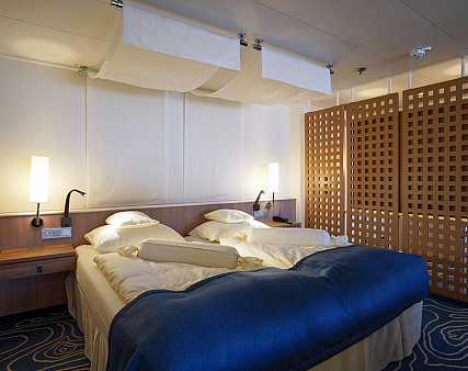 В каюте: иллюминатор, одна двуспальная кровать, кондиционер, гардероб, телевизор, телефон, фен, сейф, халаты, увлажнитель воздуха. Ванная комната с душем и туалетом.