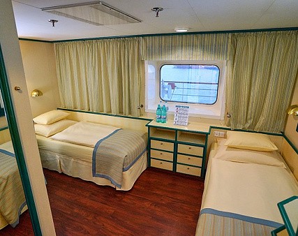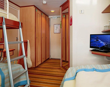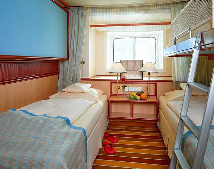 В каюте: окно с ограниченным видом (шлюпкой или конструкцией лайнера), две односпальные кровати, две верхние откидные полки-пульманы, кондиционер, гардероб, телевизор, телефон, фен, сейф, халаты, увлажнитель воздуха. Ванная комната с душем и туалетом.