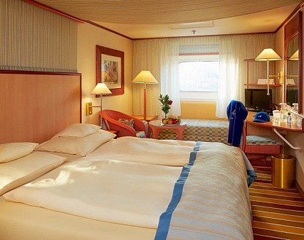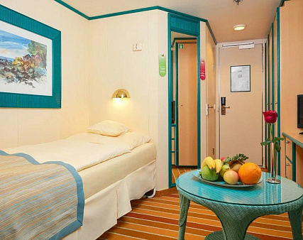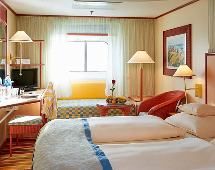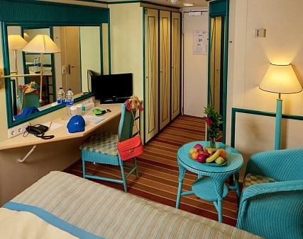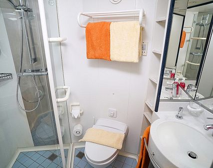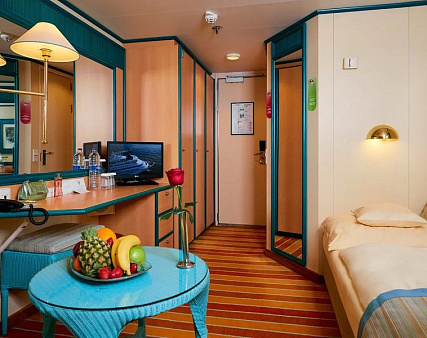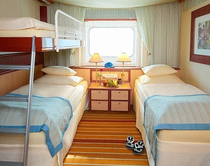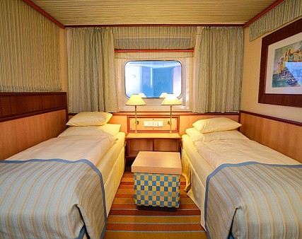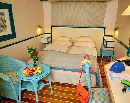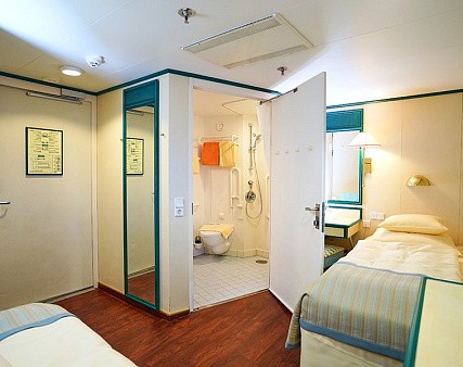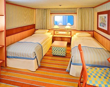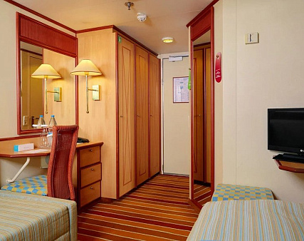 В каюте: окно с загороженным видом (шлюпкой или конструкцией лайнера), две односпальные кровати, кондиционер, гардероб, телевизор, телефон, фен, сейф, халаты, увлажнитель воздуха. Ванная комната с душем и туалетом.