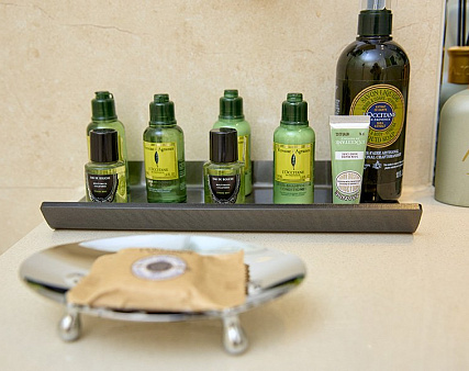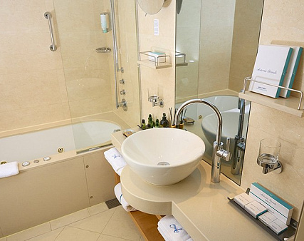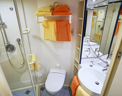 В каюте: кровать и диван (расположены буквой Г), кондиционер, гардероб, телевизор, телефон, фен, сейф, халаты, увлажнитель воздуха. Ванная комната с душем и туалетом.