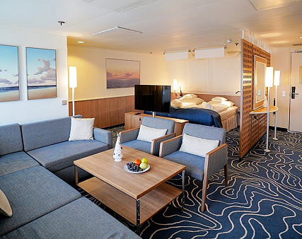 В каюте: балкон, одна двуспальная кровать, диван, холодильник, кондиционер, гардероб, телевизор, телефон, фен, сейф, халаты, увлажнитель воздуха, кофемашина, чайник. Ванная комната с ванной и туалетом.