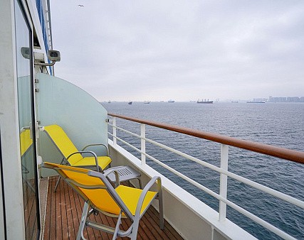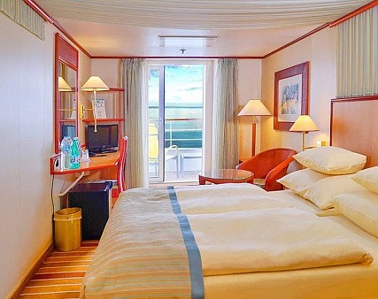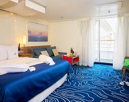 В каюте: балкон, одна двуспальная кровать, холодильник, кондиционер, гардероб, телевизор, телефон, фен, сейф, халаты, увлажнитель воздуха, кофемашина. Ванная комната с душем и туалетом.