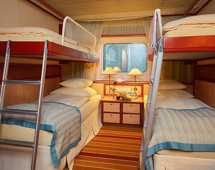 В каюте: частная палуба на 4 каюты, одна двуспальная кровать, диван, холодильник, кондиционер, гардероб, телевизор, телефон, фен, сейф, халаты, увлажнитель воздуха, кофемашина, чайник, персональный дворецкий. Ванная комната с ванной и туалетом.
