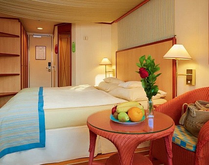 В каюте: окно с ограниченным видом (шлюпкой или конструкцией лайнера), одна двуспальная кровать, диван, кондиционер, гардероб, телевизор, телефон, фен, сейф, халаты, увлажнитель воздуха. Ванная комната с душем и туалетом.