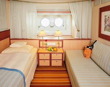 В каюте: иллюминатор, одна двуспальная кровать, кондиционер, гардероб, телевизор, телефон, фен, сейф, халаты, увлажнитель воздуха. Ванная комната с душем и туалетом.