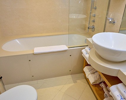 В каюте: кровать и диван (расположены буквой Г), кондиционер, гардероб, телевизор, телефон, фен, сейф, халаты, увлажнитель воздуха. Ванная комната с душем и туалетом.