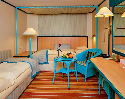 В каюте: одна двуспальная кровать, кондиционер, гардероб, телевизор, телефон, фен, сейф, халаты, увлажнитель воздуха. Ванная комната с душем и туалетом.