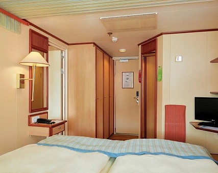 В каюте: окно с ограниченным видом (шлюпкой или конструкцией лайнера), две односпальные кровати, верхняя откидная полка-пульман, кондиционер, гардероб, телевизор, телефон, фен, сейф, халаты, увлажнитель воздуха. Ванная комната с душем и туалетом.