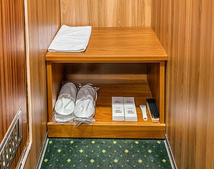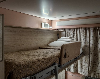 В каюте: два спальных места (одно над другим), шкаф для одежды, радио, душ, санузел, кондиционер, обзорное окно, электророзетка 220V, фен.