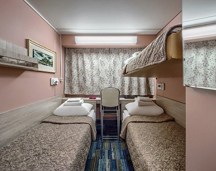 В каюте: три спальных места (два внизу, третье вторым ярусом), шкаф для одежды, радио, душ, санузел, кондиционер, обзорное окно, электророзетка 220V, фен.