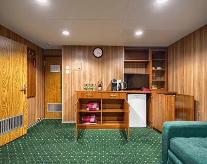 В гостиной: мягкая мебель (кресло, диван — раскладывающийся на двух человек), телевизор, холодильник, чайник, кондиционер, телефон (внутрисудовой), радио, два обзорных окна, электророзетка на 220V.