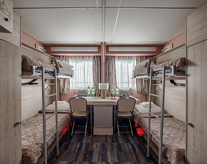 В каюте: четыре спальных места (два внизу, два вторым ярусом), шкаф для одежды, радио, душ, 2 санузла, холодильник, кондиционер, два обзорных окна, электророзетка 220V, фен.
