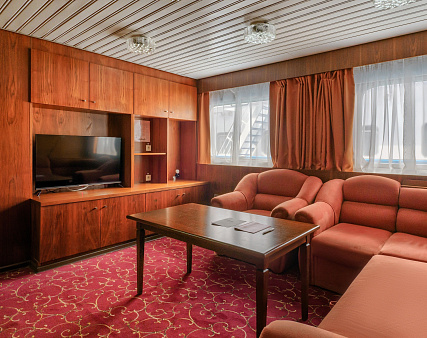 Площадь каюты — 26,87 м2 (спальня - 9,66 м2, гостиная - 17,21 м2).