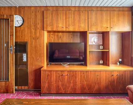В каюте: четыре спальных места (два внизу, два вторым ярусом), шкаф для одежды, холодильник, радио, душ, санузел, кондиционер, два иллюминатора, электророзетка на 220V.