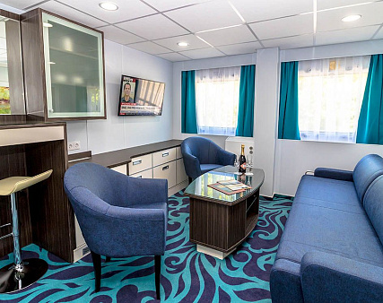 В каюте: одно спальное место, шкаф для одежды, радио, телевизор, холодильник, сейф, фен, душ, санузел, кондиционер, обзорное окно, электророзетка на 220V.