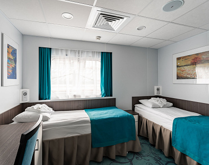 В каюте: две односпальные (сдвинуть нельзя) кровати, шкаф для одежды, трюмо, телевизор, холодильник, сейф, фен, радио, одно обзорное окно, электророзетка на 220V.