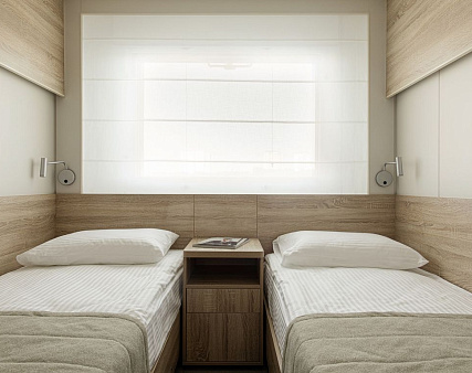 В каютах № 205,206,207,208 — две односпальные кровати размером 80х195см, которые можно сдвинуть. Площадь данных кают 16 м2.