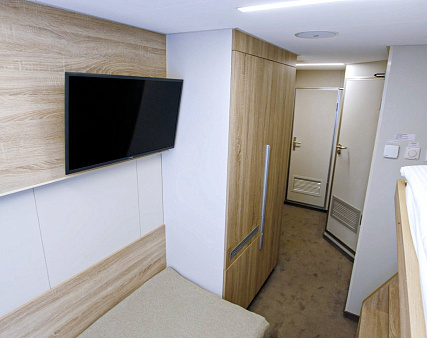 В каюте: одно спальное место, шкаф для одежды, радио, кондиционер, душ, санузел, холодильник, телевизор, фен, обзорное окно, электророзетка на 220V, площадь каюты до 7,7 м2.