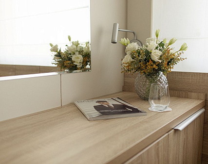 Комфортабельная гостиная с современным интерьером, шкаф для одежды, журнальный столик, диван (не раскладывается, можно разместить одного человека), пуф, трюмо, телевизор, холодильник, капсульная кофемашина, кондиционер, фен, радио, два обзорных окна, электророзетка на 220V. В спальне: двуспальная кровать, шкаф для одежды, душ, санузел, два обзорных окна.