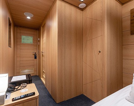 Площадь — 17,7 м2. Однокомнатная каюта с удобствами (душ, санузел, кондиционер) рассчитана на размещение до трех человек.