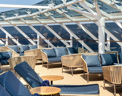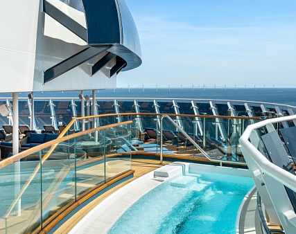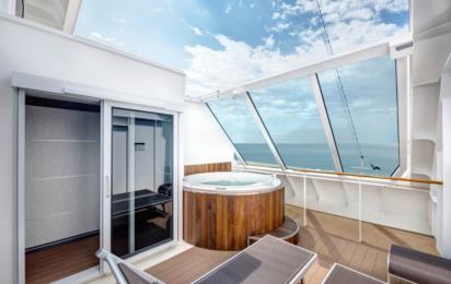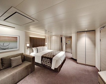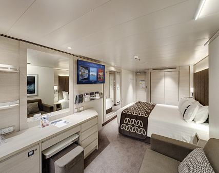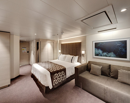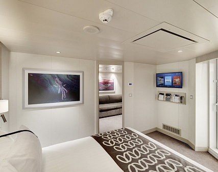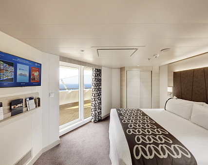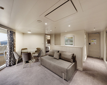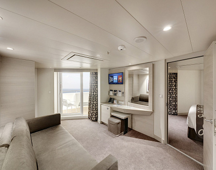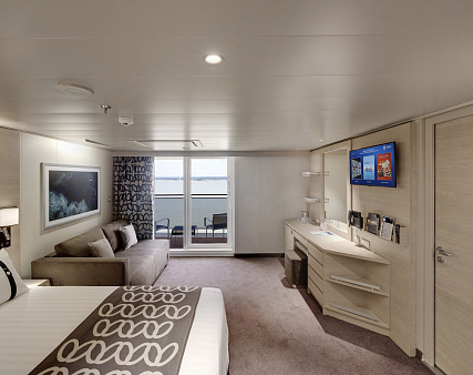 В каюте: две кровати, поставленные вместе или раздельно, дополнительные спальные места: раскладной диван, интерактивное TV, телефон, фен, мини-бар, сейф, кондиционер. Угловой балкон с персональным джакузи. Ванная комната с душевой кабиной. Зона гостиной с диваном. Виртуальный персональный круизный ассистент ZOE. Беспроводной Интернет (оплачивается дополнительно).