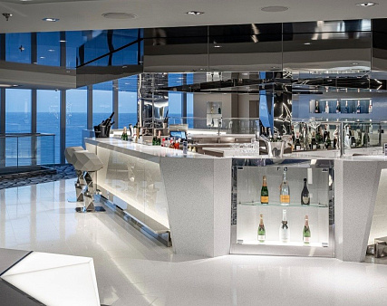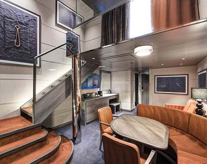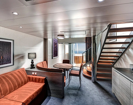 В каюте: две кровати на втором уровне каюты, поставленные вместе или раздельно, дополнительные спальные места: двуспальный раскладной диван, интерактивное TV, телефон, фен, мини-бар (включен в стоимость), сейф, кондиционер, кофемашина. Большой балкон с персональным джакузи. Зона гостиной с диваном. 2 гардеробные. 2 ванные комнаты (одна – с ванной, вторая – с душевой кабиной). Интерактивное TV, 2 телефона, фен, мини-бар, сейф, кондиционер, кофемашина. Виртуальный персональный круизный ассистент ZOE. Беспроводный интернет (безлимитный интернет-пакет Browse cruise package на 2 устройства).