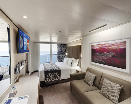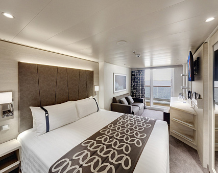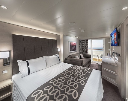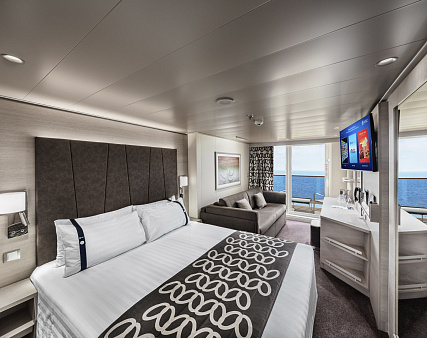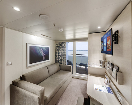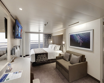 В каюте: две кровати, поставленные вместе или раздельно, дополнительные спальные места: раскладной диван, интерактивное TV, телефон, фен, мини-бар (включен в стоимость), сейф, кондиционер, кофемашина. Балкон. Ванная комната с душевой кабиной и туалетом. Виртуальный персональный круизный ассистент ZOE. Беспроводный интернет (безлимитный интернет-пакет Browse cruise package на 2 устройства).