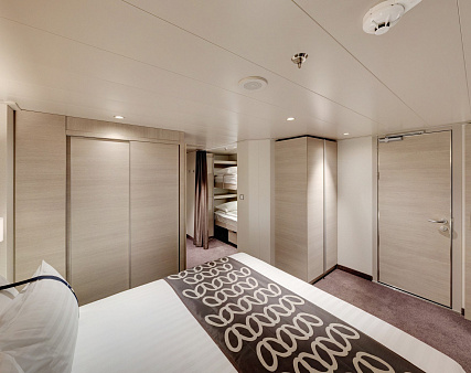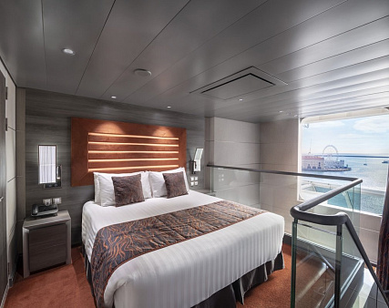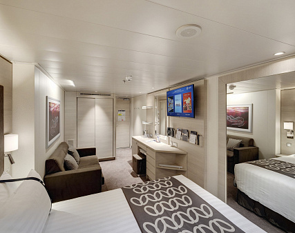 В каюте: две кровати, поставленные вместе или раздельно, дополнительные спальные места: раскладной диван и двухъярусная кровать, интерактивное TV, телефон, фен, мини-бар, сейф, кондиционер. Балкон. Ванная комната с ванной и туалетом. Виртуальный персональный круизный ассистент ZOE. Беспроводной Интернет (оплачивается дополнительно).