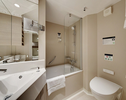 В каюте: одна большая односпальная кровать, интерактивное TV, телефон, фен, мини-бар, сейф, кондиционер. Каюта без окна. Ванная комната с душем и туалетом. Беспроводной Интернет (оплачивается дополнительно).