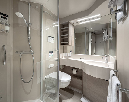 В каюте: основное спальное место: одноместная кровать / или двухъярусная кровать или диван, трансформирующийся в двухъярусную кровать, интерактивное TV, телефон, фен, мини-бар, сейф, кондиционер. Балкон. Ванная комната с душем и туалетом. Виртуальный персональный круизный ассистент ZOE. Беспроводной Интернет (оплачивается дополнительно).