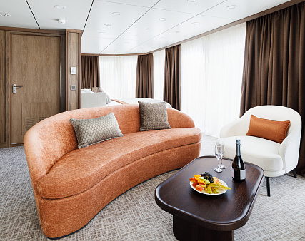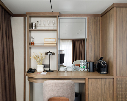 В каюте: две односпальные кровати (можно сдвинуть), прикроватные тумбы, туалетный столик, стул, шкаф, телевизор, холодильник, капсульная кофемашина (1 капсула в день на человека (по количеству гостей в каюте), чайник, радио, телефон, обзорное окно, душ, санузел, кондиционер, фен, сейф, халаты, электророзетка на 220V.