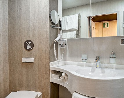 В каюте: две односпальные кровати (сдвигаются), панорамное окно, спутниковое ТВ, шкаф для одежды, холодильник, кондиционер, розетки 220V, телефон, радио, фен, капсульная кофемашина, электрочайник, сейф, душ, санузел. Площадь — 19 м2.