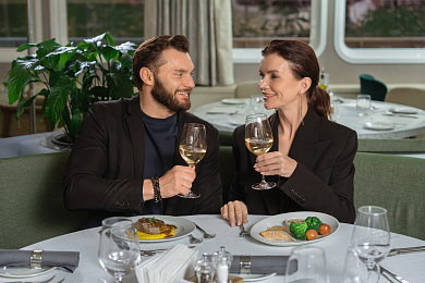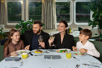 • Ужин — заказная система питания (выбор блюд со 2-го дня круиза), фиксированная рассадка. Включённые напитки (без ограничения): вода, чай, кофе, домашний морс. На выбор: вино красное / белое / игристое (1 бокал, 125 мл) / водка (1 рюмка 50 мл) / пиво (1 бокал, 300 мл).