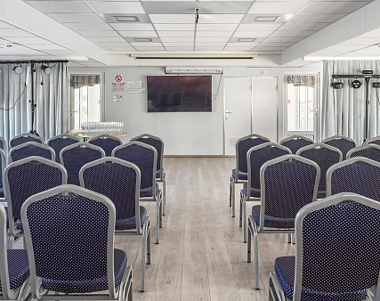В каюте: одно спальное место, шкаф для одежды, радио, телевизор, холодильник, сейф, душ, санузел, фен, кондиционер, обзорное окно, электророзетка на 220V.
