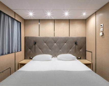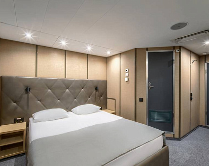 В каютах 403, 405-409, 412, 414, 419-422 (шлюпочная палуба), 323-334, 341-344 (средняя палуба) — двуспальная кровать размером 160х200 см, площадь каюты 15,5 м2