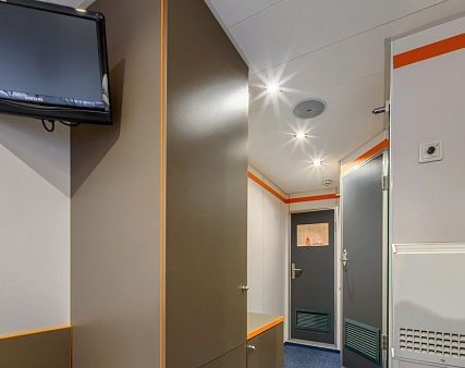 В каюте три спальных места, шкаф для одежды, холодильник, телевизор, радио, сейф, душ, санузел, кондиционер, фен, два иллюминатора, электророзетка на 220V.
