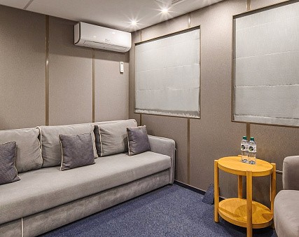 В каюте: две односпальные кровати (не сдвигаются), кресло, шкаф для одежды, пуфик, сейф, телевизор, холодильник, радио, обзорное окно, душ (душевая штора из водоотталкивающего материала или душевая стеклянная ширма), санузел, кондиционер, фен, электророзетка на 220V.